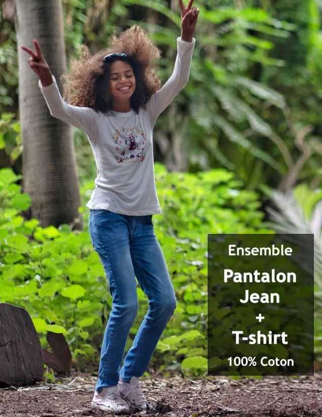 Ensemble Fille Pantalon en Jean Bleu Clair + T-Shirt manche longue Exploratrice 100% Coton