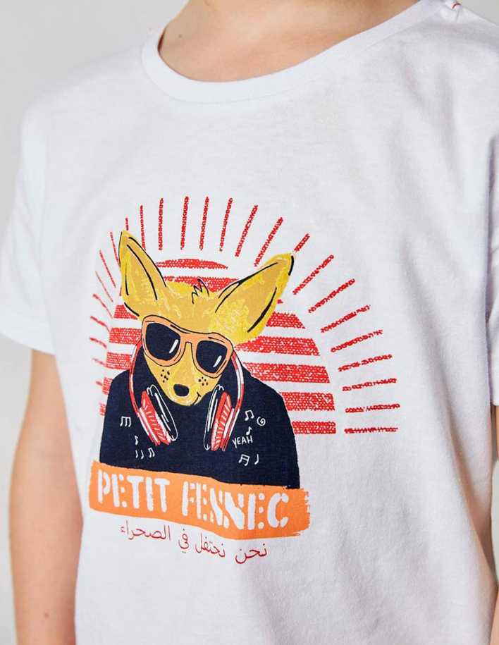 Découvrez notre T-shirt Garçon "Street Fennec", mettant en scène notre mascotte Petit Fennec dans un style urbain et musical.